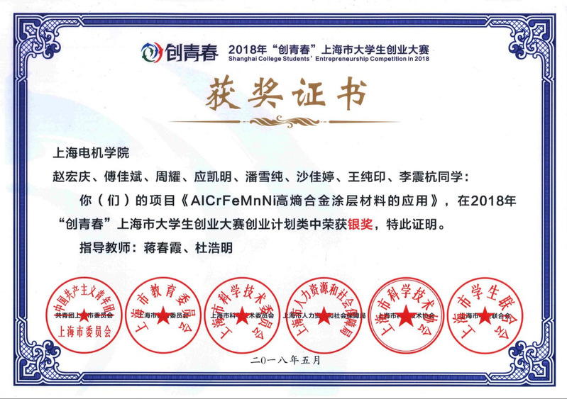 2018年5月12日,“创青春”上海市老员工创业大赛总决赛在上海电力公司校区举办,由yl23455永利师生组成的“AlCrFeMnNi高熵合金涂层材料的应用”项目作为公司参加“创青春”上海市老员工创业大赛的十个项目之一成功获得决赛资格,并获得了上海市银奖的优秀成绩。