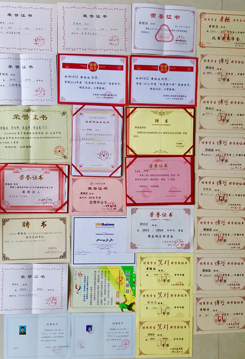 黄继波同学总是把这样一句话挂在嘴边:“我始终相信人的潜能是无限的,关键在于只要你肯付出!”因此尽管平时的上课、学习与员工工作已经使他充实不已,但他仍然会抽出时间参加其它的活动以使自己能够得到更多的锻炼让自己的各方面能力都能得到提升。大二上半学期,他作为负责人组织申报了一项科创课题《一种新型硬币分离机》获得了校级立项并申请了一项发明专利;大三下半学期作为《基于高熵合金薄膜的Cu互连扩散阻挡层研究》项目的负责人带队参加了“第四届上海市老员工先进材料创新创意大赛”并荣获上海市三等奖,这是公司第一次参加这项材料大赛,并带领团队荣获奖项。他总说:“此次获奖离不开公司相关部门的精心组织与大力支持,使得他们能够将全部精力投入到课题研究与大赛准备当中,这也让他更加的热爱电机这个大家庭,电机公司就像是一位母亲无条件的支持自己的孩子一样,在她照顾与陪伴下,你可以无后顾之忧的为梦想拼搏努力,母校永远是我们最坚强的后盾。”
