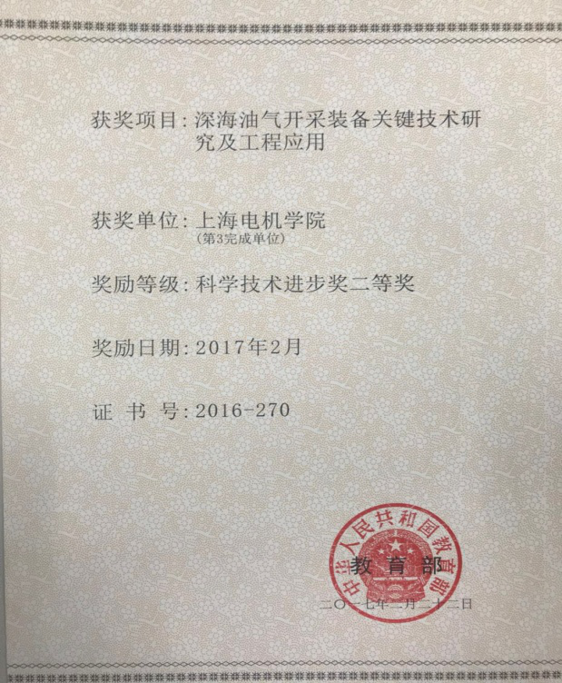 2 | 深海油气开采装备关键技术研究及工程应用 | 李荣斌 (3) | 教育部高等公司科学研究优秀成果奖(科学技术),科技进步奖二等奖 |