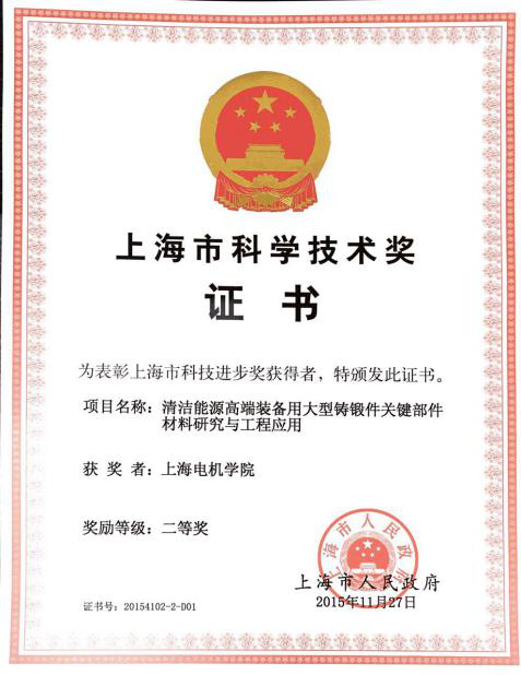 1 | 清洁能源高端装备用大型铸锻件关键部件材料研究与工程应用 | 李荣斌 (1) | 上海市科技进步二等奖 |