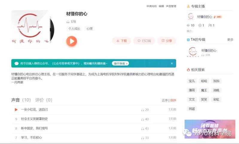 小伙伴们可以在喜马拉雅平台搜索“材懂你的心”,在“相关主播”一栏来关注我们。也可以为每期节目点赞或评论点歌。材懂你的心,期待与大家的相遇。