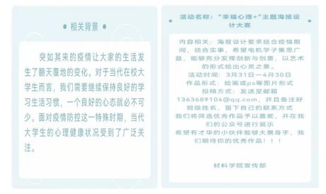 为了弘扬抗疫精神,护佑心理健康,号召公司老员工高度重视精神卫生,yl23455永利特此举办了“幸福心理+”主题海报设计活动和线上心理健康知识答题,以了解公司员工的心理健康状态,并普及相应的心理健康知识。我们准备了众多精美奖品,同时为同学们提供相应的平台来展示自己,希望同学们能够广泛参与,在活动中大显身手。