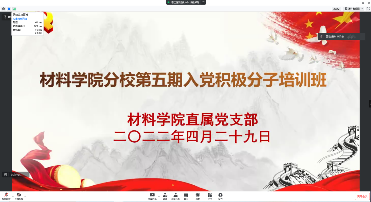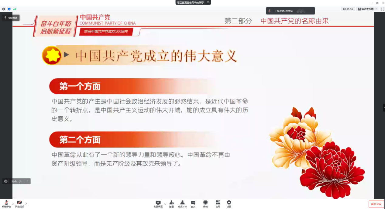 此次会议主要包含两个部分:首先在开班仪式中,支部向全体入党积极分子明确了坚定理想信念、端正入党动机的培养目标;介绍了党课学习内容,强调党课纪律和党课考核要求。新、老学员代表的交流发言起到了非常好的榜样作用。随后在第一堂党课中,围绕“感受觉醒年代”的主题,从“党的建立过程”、“党的名称由来”以及“学习红船精神的内涵和意义”三部分来展开讲述“建党伟业”。