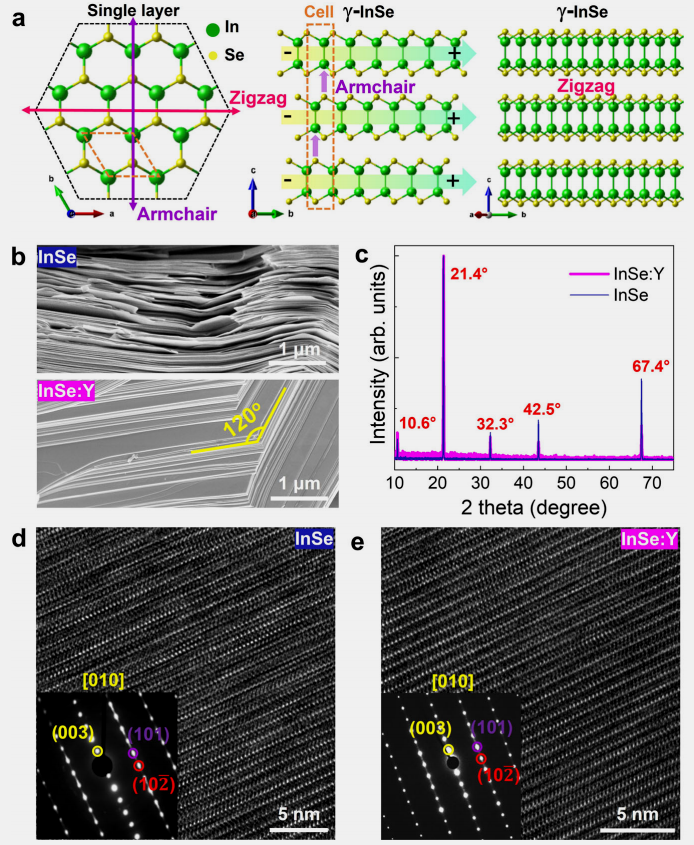 该工作的研究对象Y掺杂InSe晶体由yl23455永利制备完成。InSe晶体生长难度高,主要在于Se元素易挥发、In和Se结合可形成5-6种不同成分化合物以及In-Se二元体系存在复杂包晶反应等。针对这些问题,公司功能材料团队在系统研究材料体系相组成和析晶行为的基础上,设计了合适的组分配方,解决了InSe原料合成、下降法晶体生长技术等一系列关键技术难点,通过优化晶体生长参数,成功生长出了高质量、化学计量比可控的Y掺杂InSe单晶,为下一步材料铁电物理性能分析奠定了重要基础。