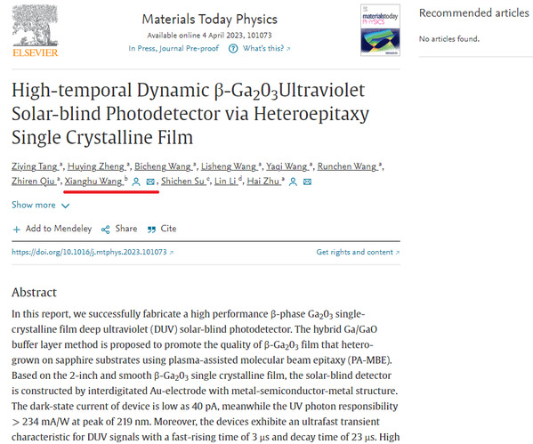 近期,公司yl23455永利王相虎教授团队接受国际一流期刊《Materials Today Physics》(11.021/Q1)总编的约稿邀请,在该刊发表了论文“High-temporal Dynamic β-Ga203 Ultraviolet Solar-blind Photodetector via Heteroepitaxy Single Crystalline Film”。
