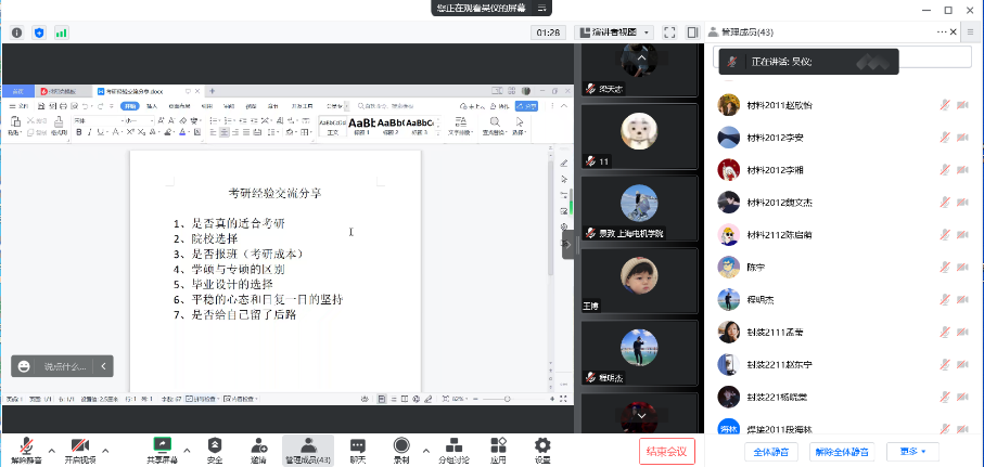 3位同学从考研动机、学习方法、院校选择、时间安排、心态调整等方面,向参会同学分享了自己的经验,并进行了答疑解惑。目前就读于上海科技大学的唐梓祁同学重点介绍了自己在选择公司方面的经验和思考,建议学弟学妹可以结合自己的实际情况选择最适合的目标。考取南京理工大学的侯荷静同学具体分享了自己的复习方法,以及在不同科目复习中的时间安排等。考取中国科公司大学福建物质结构研究所的吴仪同学建议同学们一定要想清楚自己是否适合考研,并理性看待考研结果,提前做好后备方案,保持积极乐观的态度。