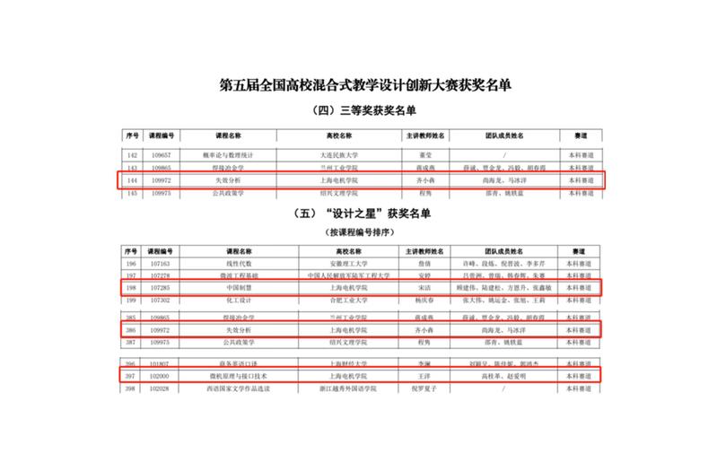 经过数轮次的专家培训指导及教师认真准备,9月18日3位教师顺利完成了大赛复赛材料的提交。10月-11月,第五届全国高校混合式教学设计创新大赛举办了复赛网络评审和全国现场决赛,最终评选出特等奖12项、一等奖102项、二等奖169项、三等奖169项、设计之星562项、优胜奖561项、专项奖16项、优秀组织奖26项。