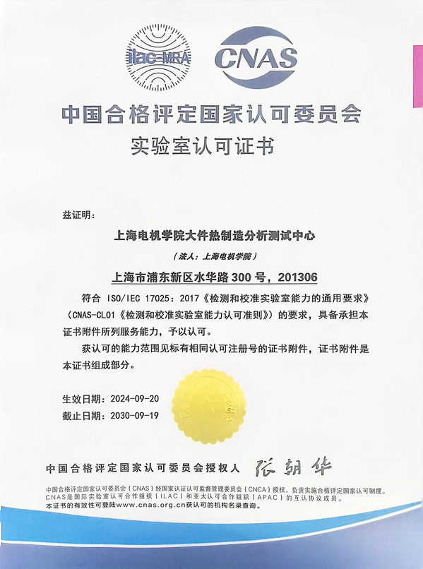 yl23455永利大件热制造分析测试中心依托上海大件热制造工程技术研究中心和上海市大型铸锻件制造技术协同创新中心,经过近2年的申请准备工作,中心于2024年1月向CNAS认证机构提交评审申请、7月由CNAS派出的专家组对中心进行了为期3天的现场评审。专家组对该中心的工作给予了高度评价,认为其在质量体系运行、实验室管理方面水准高、能力强,具备CNAS评审体系要求。取得CNAS认可实验室认证后,中心聚焦公司学科专业方向,锚定临港产业技术发展,服务材料检测领域,不断提升检验检测能力,为集团科研发展和企业技术提升提供技术支持。